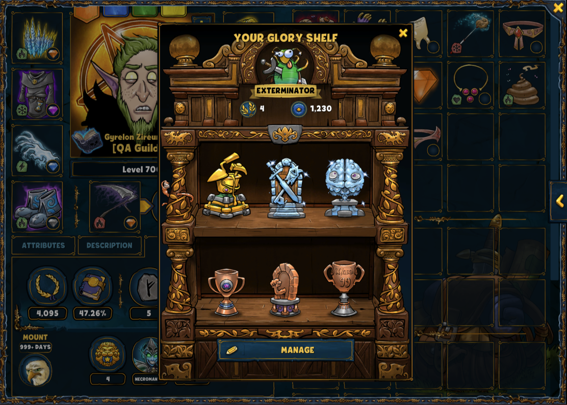 Como se mencionó anteriormente, puedes mostrar los trofeos obtenidos mediante hazañas en tu Estantería de Gloria, en la pantalla de tu personaje. Si quieres presumir, visita el Mercado Negro, donde las versiones premium te permiten mostrar tres trofeos más.